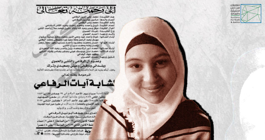 بتاريخ 8 تشرين الأول/نوفمبر 2022، نشرت صحيفة “الوطن” المقربة من الحكومة السورية على صفحتها الرسمية أن محكمة الجنايات الأولى في دمشق أصدرت حكماً قابلاً للطعن بحق الجناة المسؤولين عن مقتل الشابة السورية (آيات الرفاعي)، وهم: زوج آيات الرفاعي والده ووالدته.
