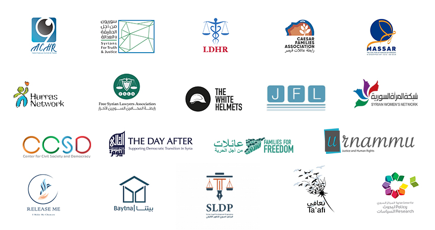 [1] المنظمات المساهمة هي: البرنامج السوري للتطوير القانوني، محامون وأطباء من أجل حقوق الإنسان، رابطة المحامين السوريين الأحرار، تحالف أسر الأشخاص المختطفين لدى تنظيم الدولة الإسلامية (مسار)، مبادرة تعافي، شبكة المرأة السورية (شمس)، سوريون من أجل الحقيقة والعدالة، شبكة حراس الطفولة، اليوم التالي، مشروع حماية، العدالة من أجل الحياة، أورنامو للعدالة وحقوق الإنسان، المركز السوري لبحوث السياسات، مركز وصول لحقوق الإنسان، رابطة عائلات قيصر، مركز المجتمع المدني والديمقراطية، الخوذ البيضاء، بيتنا، عائلات من أجل الحرية.