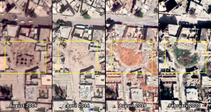 أظهرت صور الأقمار الاصطناعية المأخوذة خلال فترة سيطرة تنظيم “داعش” على المدينة هدم الكنيس اليهودي، ثم أظهرت في عام 2019 وجود علامات حفر، وزوال الكنيس بشكل تام.