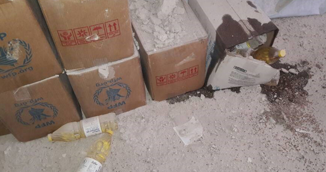 صورة تظهر الأضرار التي لحق بمعونات الأمم المتحدة التي أودعت في مستودع الأغذية التابع للمجلس المحلي في مدينة دوما، وذلك عقب تعرضها للقصف من قبل القوات النظامية السورية وحلفائها بتاريخ 15 تشرين الثاني/نوفمبر 2017، مصدر الصورة: قناة التلغرام الخاصة بمركز دمشق الاعلامي.