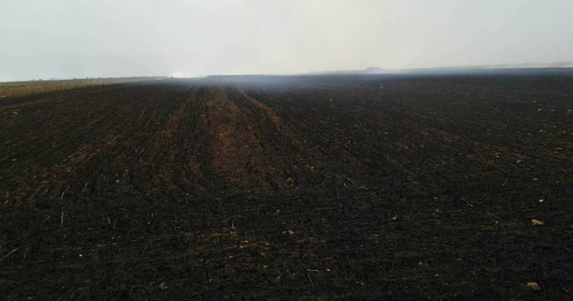 صور خاصة بسوريون من أجل الحقيقة والعدالة، تظهر جانباً من أرض المزارع "قاسم الخضيري" عقب تعرضها للقصف بمواد حارقة وذلك بتاريخ 28 نيسان/أبريل 2018.