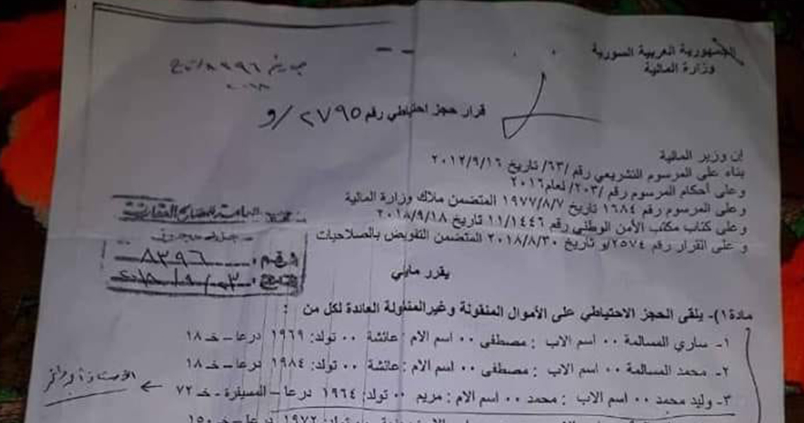أصدرت وزارة المالية التابعة لرئاسة مجلس الوزراء في الحكومة السورية قراراً ينصّ على وضع الحجز الاحتياطي على الأموال المنقولة وغير المنقولة والتي تعود ملكيتها إلى 13 شخصاً من محافظة درعا، بحجة "ثبوت تورطهم في الأعمال الإرهابية التي يشهدها القطر"، وصدر القرار بتاريخ 19 أيلول/سبتمبر 2018، ولكنّه عُمم مؤخراً. وبحسب شهادات جمعتها سوريون من أجل الحقيقة والعدالة فقد تبين أن بعض الأشخاص المعنيين بالحجز هم قادة عسكريون سابقون وأطباء وناشطون في منظمات المجتمع المدني، كما أن بينهم شخصَين متوفيين قبل خمسة أعوام من صدور القرار.