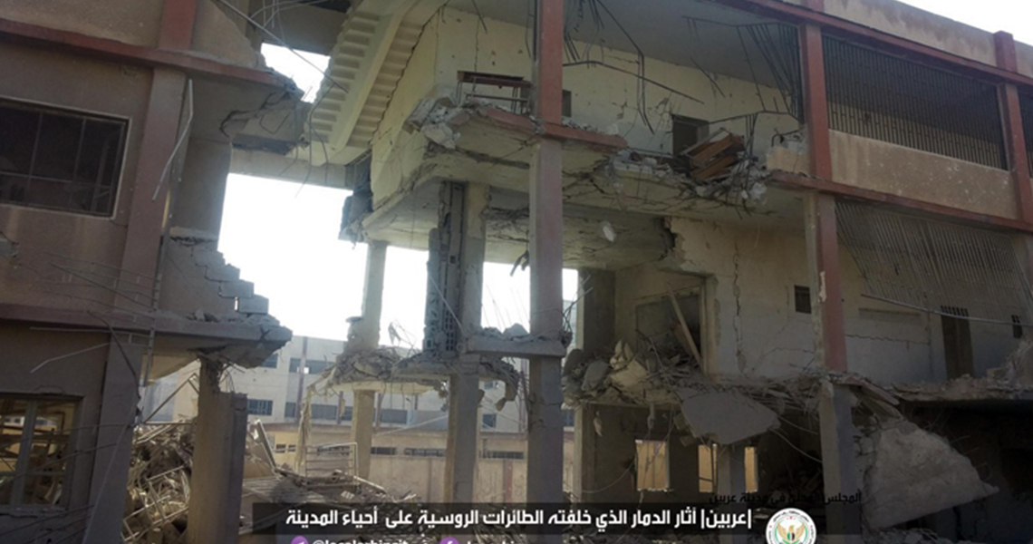 "Since the start of the military campaign, about 15 schools have been bombed and destroyed completely or partially, in the first stage of the battle which began on November 15, 2017, three primary schools in Jisreen town were targeted by Golan local-made rockets which were launched from Al Mleha town, held by the Regime. In Saqba town, two schools, one for boys and the other for girls, were bombed by Russian warplanes. In Hamoryah, a kindergarten has been completely destroyed, in addition to another one affiliated to Teachers' Union which got out of service. During the second stage of the battle, which began in late December 2017 and lasted until the end of January 2018, three schools in Irbin were subjected to direct bombardment by Russian aircraft during the first days of the campaign, the last of which was a high school for girls that was hit by a Russian air raid which totally destroyed it and let it got out of service. The school had 263 students, and 30 staff members."