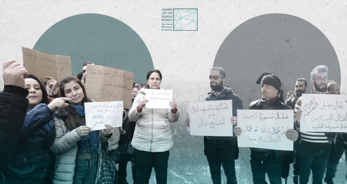 While certain advocacy efforts and public pressure succeeded in suspending some of the arbitrary dismissal decisions such as in the Directorate of Health in Daraa (according to witness testimonies) and in the public establishments of electricity and agriculture in Sweida, according to local activists, STJ documented the formation of special committees to review objections to the dismissals, as in the case of the establishment of electricity in Damascus. However, it was not possible to verify whether any of these objections were actually reviewed or whether any formal responses –positive or negative– were issued.