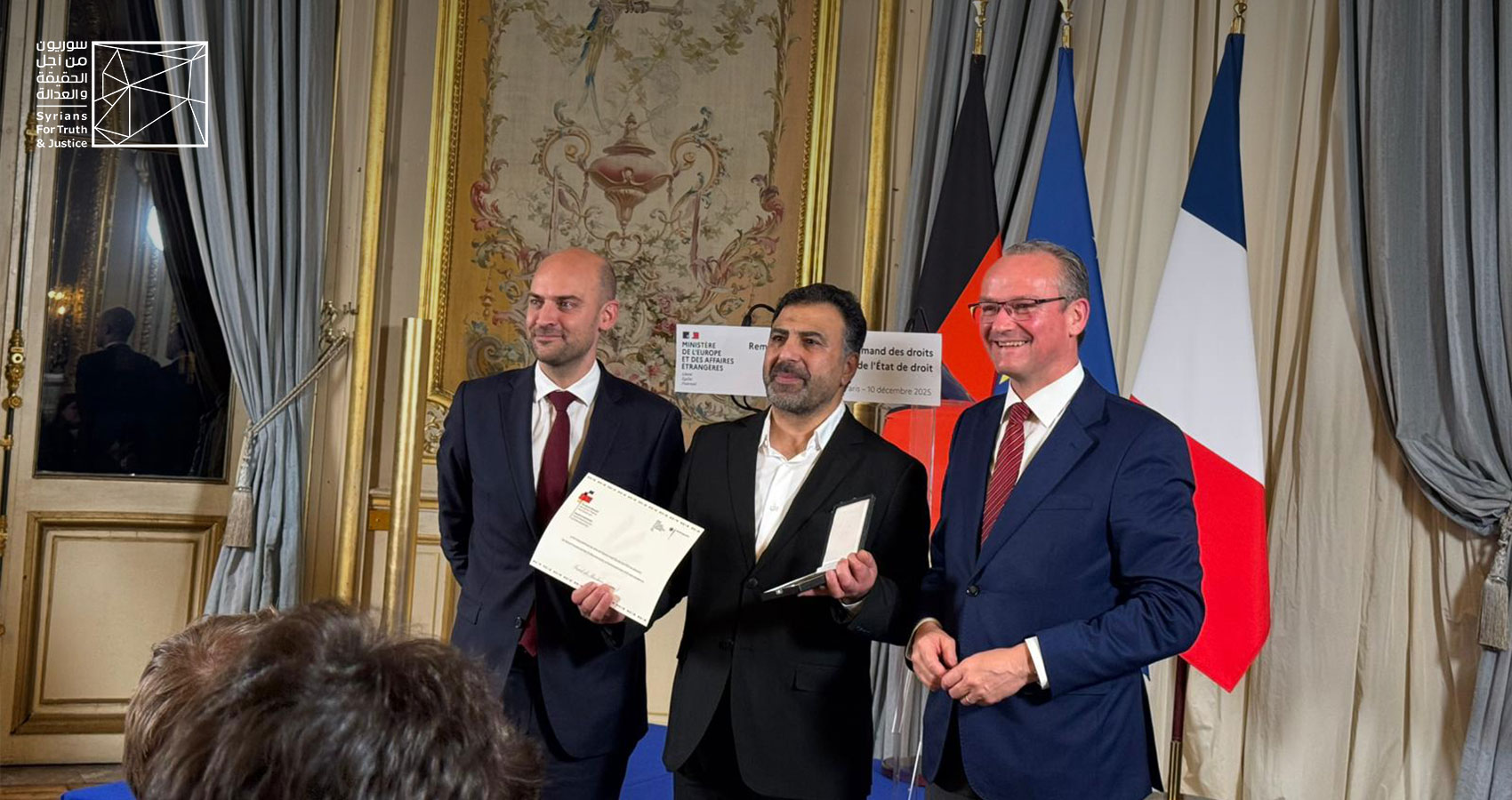 The award ceremony, held at the headquarters of the French Ministry of Foreign Affairs, was attended by Mr. Jean-Noël Barrot, France’s Minister for Europe and Foreign Affairs, and Mr. Gunther Krichbaum, Germany’s Minister of State for European Affairs, who presented the prize to al- Madhhan. Syrians for Truth and Justice (STJ) was honored to attend, represented by its Executive Director, Bassam al-Ahmad, along with representatives from several other Syrian civil society organizations active in human rights and transitional justice.