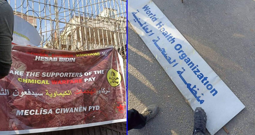At around 3:30 P.M. on Wednesday, a group of about 20 persons assembled in front of the office of the World Health Organization (WHO) and an adjacent civilian building. The group held a sign, reading: “Partners in chemical attacks shall pay the price”, in Arabic, Kurdish, and English.